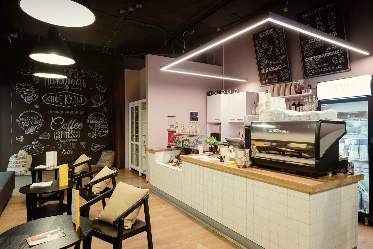 Современная кофейня: располагается в Бизнес-Центре класса А, в менее 5-ти минут пешком от метро.