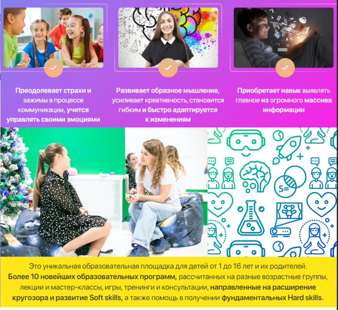 Центр предлагает в данный момент 7 авторских курсов для детей в возрасте от 1 года до 16 лет. Также стоит отметить, что центр занимает 70% рынка в Приморском районе, согласно данным на ноябрь 2022 года.