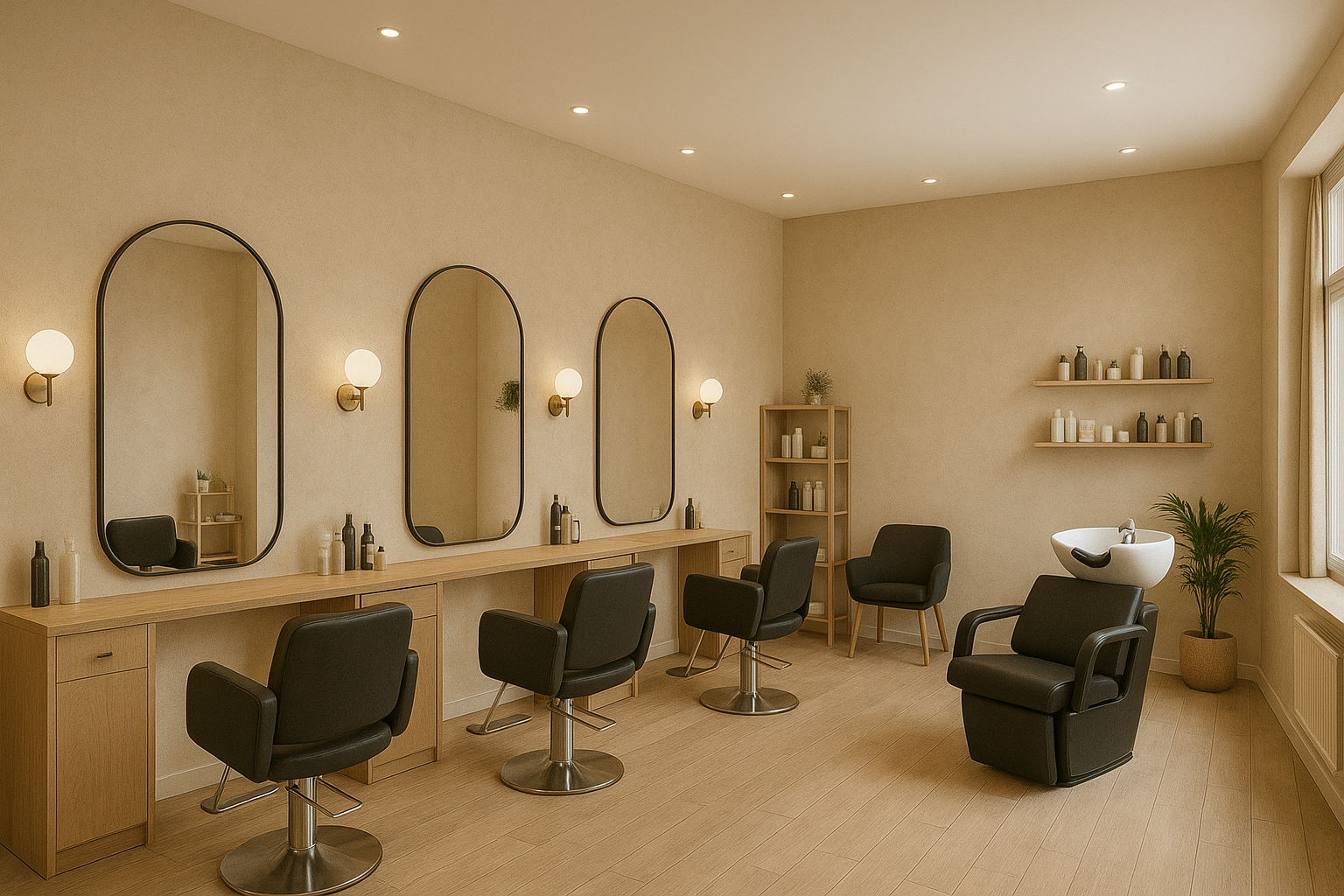 - Зоны: 5 отдельных залов (для парикмахеров, мастеров маникюра и педикюра, косметологов и массажистов, визажистов), зона стерилизации, кухня для персонала, санузел.
