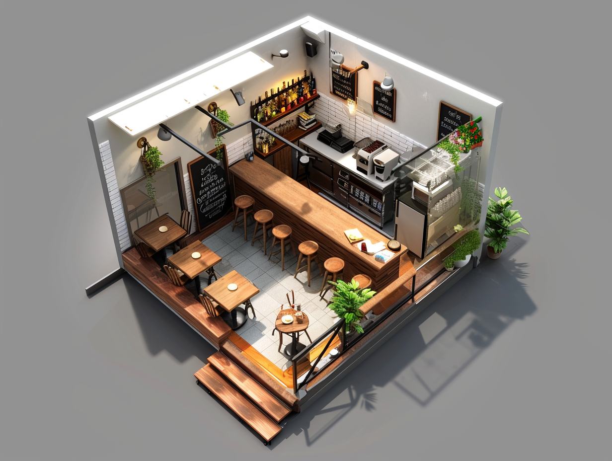 - посадочная зона (2 столика+стулья+барные стулья)