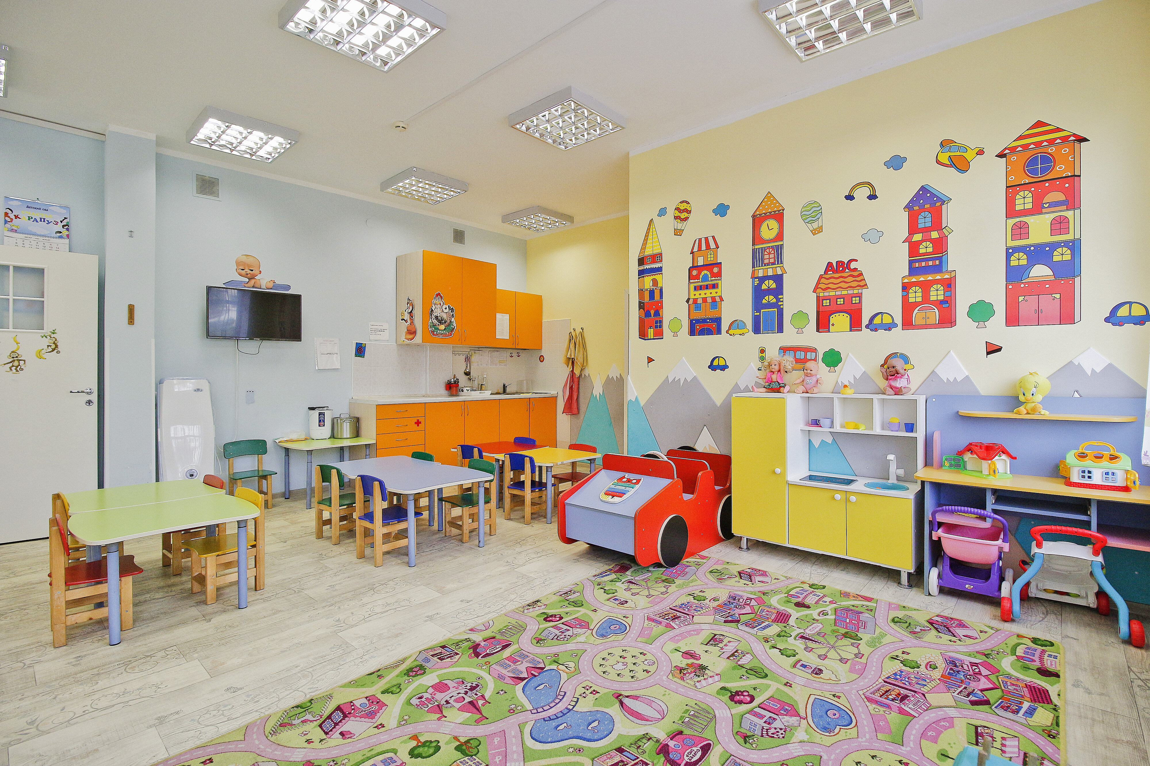 В каждой комнате яркий светлый ремонт, для детишек есть большое количество игрушек, обучающих пособий.